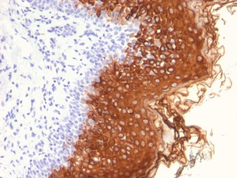 - This MAb recognizes a protein of 56.5 kDa, identified as cytokeratin 10 (CK10). CK10 is expressed in all suprabasal layers of the epidermis. In the epidermis, expression of CK10 strictly parallels the extent of differentiation, it is absent in the basal layer, appears in the first suprabasal layers and increases in concentration towards the granular layer. However, CK10 is rarely detected in early stages of vulvar squamous carcinomas (tumors less than 2 cm, clinical stage I) regardless of the tumor grade. In larger and more advanced tumors (greater than 2 cm, clinical stages II and III), CK10 is detected very frequently. Expression of CK10 is related to maturation of malignant keratinocytes, being preferentially detected in more-differentiated parts.