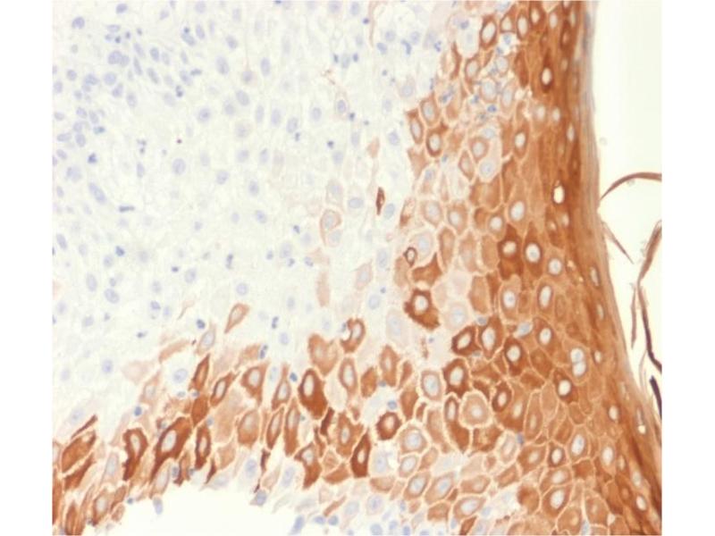 - This MAb recognizes a protein of 56.5 kDa, identified as cytokeratin 10 (CK10). CK10 is expressed in all suprabasal layers of the epidermis. In the epidermis, expression of CK10 strictly parallels the extent of differentiation, it is absent in the basal layer, appears in the first suprabasal layers and increases in concentration towards the granular layer. However, CK10 is rarely detected in early stages of vulvar squamous carcinomas (tumors less than 2 cm, clinical stage I) regardless of the tumor grade. In larger and more advanced tumors (greater than 2 cm, clinical stages II and III), CK10 is detected very frequently. Expression of CK10 is related to maturation of malignant keratinocytes, being preferentially detected in more-differentiated parts.