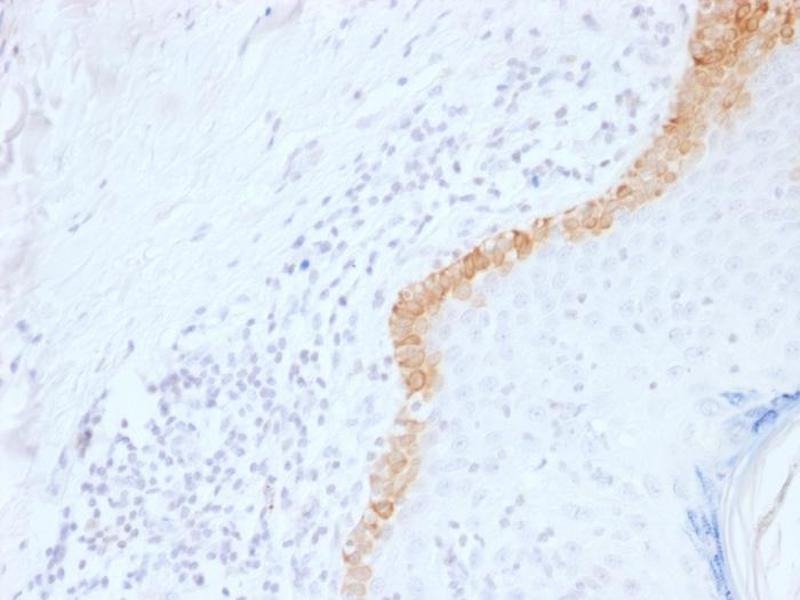 - Keratin 15 is a type I keratin which is expressed only in basal keratinocytes in stratified epithelia and does not appear to have a natural type II expression partner. Keratin 15 is down regulated in activated keratinocytes. Cytokeratin 15 is a specific marker of stem cells of the hair-follicle bulge and may be a useful marker for diagnosis between basal cell carcinoma (BCC) and trichoepithelioma. Trichoblastoma are benign neoplasms of follicular differentiation frequently found in nevus sebaceous. Many morphologic features are shared with nodular basal cell carcinoma, sometimes rendering a diagnosis difficult. Trichoblastoma and BCC show variable expression of Cytokeratin 15 and Cytokeratin 19, and absence of hair keratins.