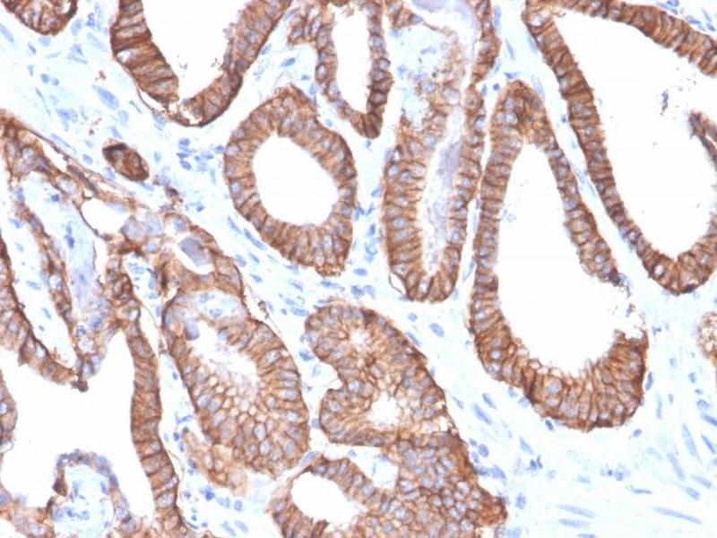 - Epitope of this MAb is mapped between aa 202-212 of EGP40, which is a 40-43 kDa transmembrane epithelial glycoprotein, also identified as epithelial specific antigen (ESA), or epithelial cellular adhesion molecule (Ep-CAM). It is expressed on baso-lateral cell surface in most simple epithelia and a vast majority of carcinomas. Antibody to Ep-CAM has been used to distinguish adenocarcinoma from pleural mesothelioma and hepatocellular carcinoma. This antibody is also useful in distinguishing serous carcinomas of the ovary from mesothelioma.