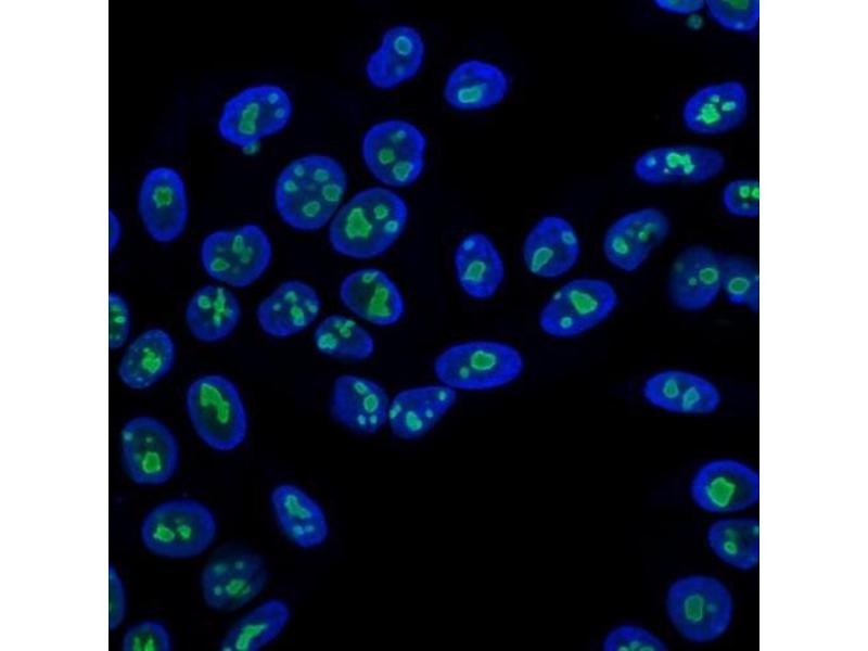 - Recognizes a protein of ~76 kDa, which is identified as Nucleolin (NCL). It is the major nucleolar phosphoprotein of growing eukaryotic cells. NCL is located mainly in dense fibrillar regions of the nucleolus. It is found associated with intranucleolar chromatin and pre-ribosomal particles. Human NCL gene consists of 14 exons with 13 introns and spans approximately 11kb. It induces chromatin decondensation by binding to histone H1. It is thought to play a role in pre-rRNA transcription and ribosome assembly.This Mouse Monoclonal Antibody can be used to stain the nucleoli in cell or tissue preparations and can be used as a marker of the nucleoli in subcellular fractions. It produces a speckled pattern in the nuclei of cells of normal and malignant cells and may be used to stain the nucleoli of cells in fixed or frozen tissue sections. It can be used with paraformaldehyde fixed frozen tissue or cell preparations and formalin fixed, paraffin-embedded tissue sections.