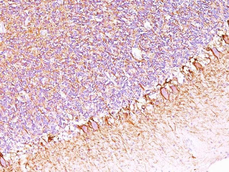 - This MAb reacts with a 200 kDa protein, identified as heavy sub-unit of neurofilaments (NF-H). Neurofilaments make up the main structural elements of axons and dendrites and are found in neurons, peripheral nerves, and sympathetic ganglion cells. Neurofilaments consist of three major subunits with molecular weights of 68 kDa (NF-L), 160 kDa (NF-M) and 200 kDa (NF-H). Anti-neurofilament stains a number of neural, neuroendocrine, and endocrine tumors. Neuromas, ganglioneuromas, gangliogliomas, ganglioneuroblastomas, and neuroblastomas stain positively for anti-neurofilament. Neurofilaments are also present in paragangliomas as well as adrenal and extra-adrenal pheochromocytomas. Carcinoids, neuroendocrine carcinomas of the skin, and oat cell carcinomas of the lung also express neurofilament.