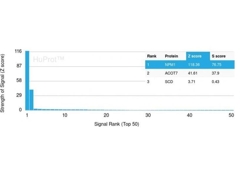 - Recognizes a 33 kDa glycoprotein, identified as Nucleophosmin (NPM). It is predominantly localized in the nucleus of cells in most tissues. NPM is involved in ribosomal assembly and rRNA transport. It is an abundant protein that is highly phosphorylated by Cdc2 kinase during mitosis. This phosphoprotein moves between the nucleus and the cytoplasm. It is thought to be involved in several processes including regulation of the ARF/p53 pathway. A number of genes are fusion partners, in particular the anaplastic lymphoma kinase gene on chromosome 2. Mutations in exon 12 affecting the C-terminus of the protein are associated with an aberrant cytoplasmic location. Mutations in this gene are associated with acute myeloid leukemia. The antibody may be a useful aid for classification of acute myeloid leukemia.