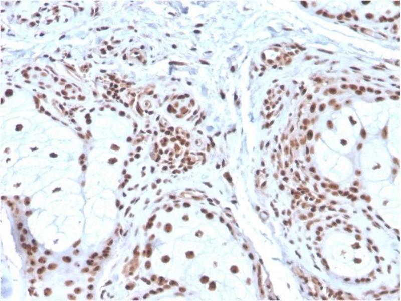 - Recognizes a 33 kDa glycoprotein, identified as Nucleophosmin (NPM). It is predominantly localized in the nucleus of cells in most tissues. NPM is involved in ribosomal assembly and rRNA transport. It is an abundant protein that is highly phosphorylated by Cdc2 kinase during mitosis. This phosphoprotein moves between the nucleus and the cytoplasm. It is thought to be involved in several processes including regulation of the ARF/p53 pathway. A number of genes are fusion partners, in particular the anaplastic lymphoma kinase gene on chromosome 2. Mutations in exon 12 affecting the C-terminus of the protein are associated with an aberrant cytoplasmic location. Mutations in this gene are associated with acute myeloid leukemia. The antibody may be a useful aid for classification of acute myeloid leukemia.