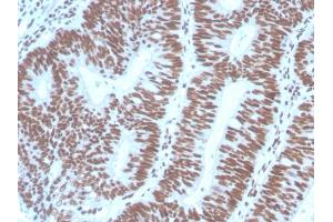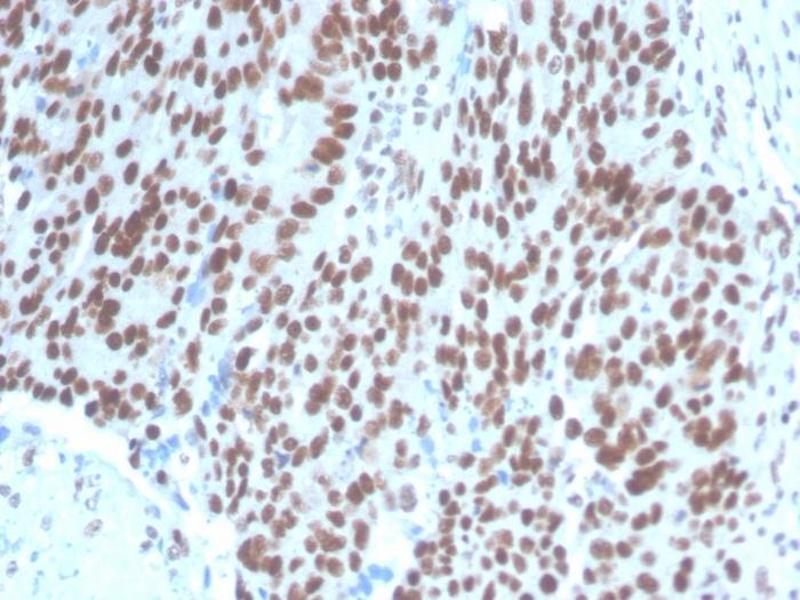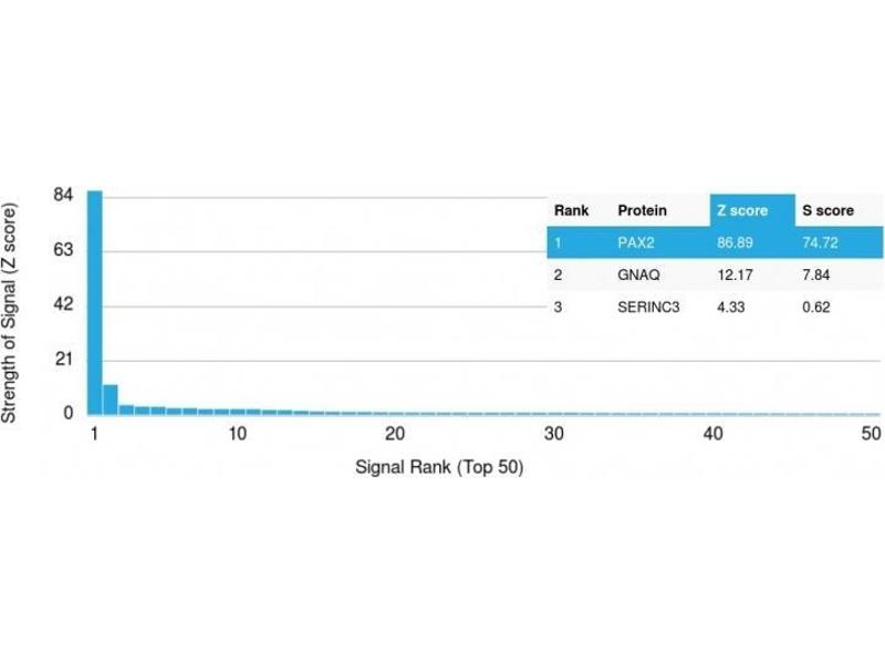 - Recognizes a protein of 42 kDa, which is identified as PAX2. It is a member of the paired box family of transcription factors, which is required for development and proliferation of the kidney, brain, and mullerian organs. PAX2 genes contain a highly conserved DNA sequence within the paired box region, which encodes a DNA-binding domain, enabling PAX proteins to bind the promoters of specific genes to transcriptionally regulate their expression. PAX2 is specifically expressed in the developing central nervous system, eye, ear, and urogenital tract, and is essential for the development of these organs. In normal adult tissues PAX2 was mainly detected in the urogenital system, including kidney, ureteric epithelium, fallopian tube epithelium, ovary and uterus. In tumors, PAX2 has been detected in renal cell carcinomas, Wilms' tumors, nephrogenic adenomas and papillary serous carcinoma of the ovary. PAX2 has been used as a marker for the identification of renal cell carcinoma and ovarian carcinoma by immunohistochemistry.