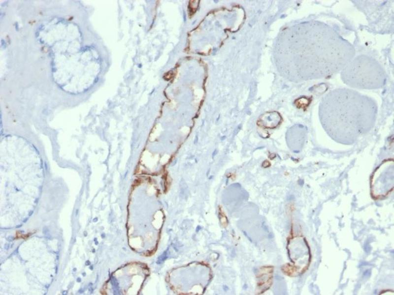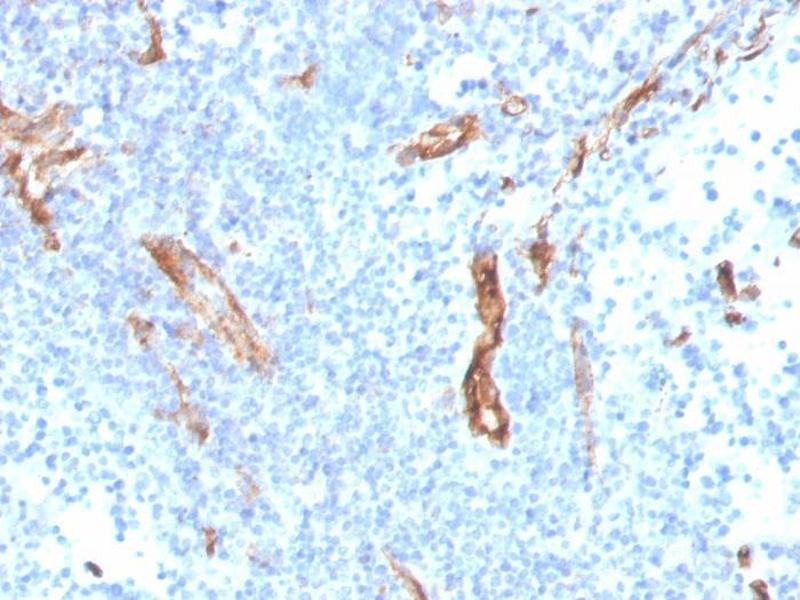 CD31 (PECAM-1) is a transmembrane glycoprotein member of the immunoglobulin supergene family of adhesion molecules. CD31 is expressed by stem cells of the hematopoietic system and is primarily used to identify and concentrate these cells for experimental studies as well as for bone marrow transplantation. Anti-CD31 has shown to be highly specific and sensitive for vascular endothelial cells. Staining of nonvascular tumors (excluding hematopoietic neoplasms) is rare. CD31 MAb reacts with normal, benign, and malignant endothelial cells which make up blood vessel lining. The level of CD31 expression can help to determine the degree of tumor angiogenesis, and a high level of CD31 expression may imply a rapidly growing tumor and potentially a predictor of tumor recurrence.