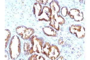 - Recognizes a protein of 52 kDa, identified as prostate specific acid phosphatase (PSAP). This enzyme catalyzes the conversion of orthophosphoric monoester to alcohol and orthophosphate. It is synthesized under androgen regulation and is secreted by the epithelial cells of the prostate gland.PSAP is found in non-neoplastic adult and fetal prostatic glands, primary and metastatic prostatic carcinomas. It shows no staining in granulocytes, osteoclasts, parietal cells of the stomach, liver cells, renal cell or breast carcinomas.