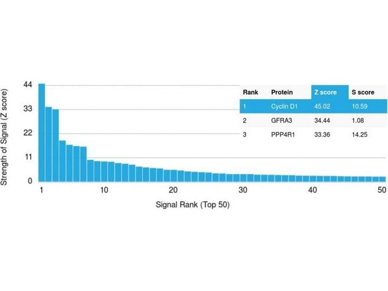 - Recognizes a protein of 36 kDa, identified as cyclin D1. Cyclin D1, one of the key cell cycle regulators, is a putative proto-oncogene overexpressed in a wide variety of human neoplasms. This antibody neutralizes the activity of cyclin D1 in vivo. About 60 % of mantle cell lymphomas (MCL) contain a t(11, 14)(q13, q32) translocation resulting in over-expression of cyclin D1. This antibody is useful in identifying mantle cell lymphomas (cyclin D1 positive) from CLL/SLL and follicular lymphomas (cyclin D1 negative). Occasionally, hairy cell leukemia and plasma cell myeloma weakly express Cyclin D1.