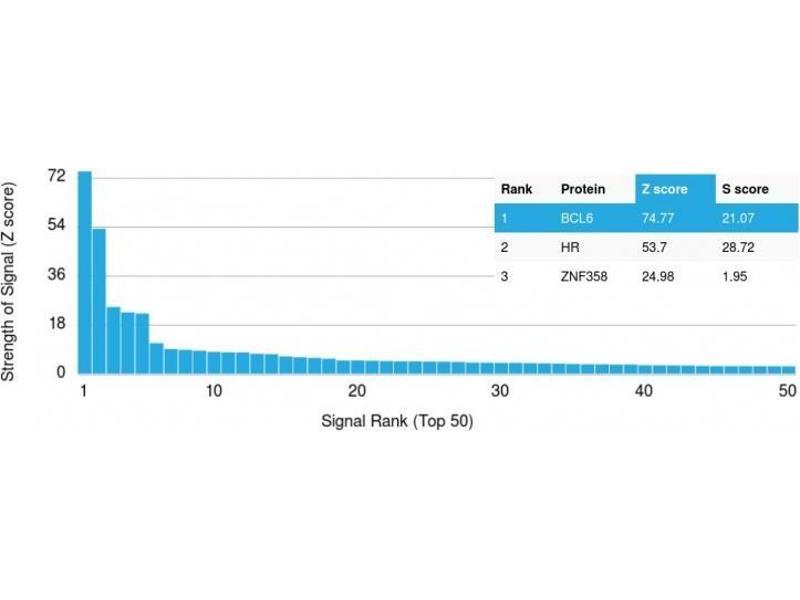 - The specificity of this monoclonal antibody to its intended target was validated by HuProtTM Array, containing more than 19,000, full-length human proteins. Recognizes a protein of 95 kDa, which is identified as Bcl-6. Antibody to bcl-6 is helpful in a number of diagnostic settings: (1) In the differential diagnosis of small B-cell lymphoma. Follicular lymphoma will show bcl-6 (and CD10) positivity whereas other small B-cell lymphomas are usually negative. (2) Bcl-6 is an important prognostic marker in diffuse large B-cell lymphomas (DLBCL), where CD10, bcl-6 and MUM1/IRF4 are used to identify germinal center and activated B-cell phenotypes. (3) Bcl-6 can be valuable in distinguishing classical Hodgkin lymphoma from nodular lymphocyte predominant Hodgkin lymphoma (NLPHL). The Reed-Sternberg cells of classical Hodgkin lymphoma are bcl-6 negative whereas the large ('LH') cells of NLPHL are bcl-6 positive. In contrast, anti-Bcl-6 rarely stains mantle-cell lymphoma and MALT lymphoma.