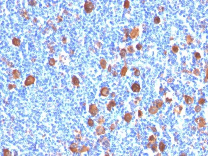 - Recognizes a protein of 55 kDa, which is identified as fascin-1. Its actin binding ability is regulated by phosphorylation. Antibody to fascin-1 is a very sensitive marker for Reed-Sternberg cells and variants in nodular sclerosis, mixed cellularity, and lymphocyte depletion Hodgkin's disease. It is uniformly negative in lymphoid cells, plasma cells, and myeloid cells. Fascin-1 is also expressed in dendritic cells. This marker may be helpful to distinguish between Hodgkin lymphoma and non-Hodgkin lymphoma in difficult cases. Also, the lack of expression of fascin-1 in the neoplastic follicles in follicular lymphoma may be helpful in distinguishing these lymphomas from reactive follicular hyperplasia in which the number of follicular dendritic cells is normal or increased. Antibody to fascin-1 has been suggested as a prognostic marker in neuroendocrine neoplasms of the lung as well as in ovarian cancer. Fascin-1 expression may be induced by Epstein-Barr virus (EBV) infection of B cells with the possibility that viral induction of fascin in lymphoid or other cell types must also be considered in EBV-positive cases.