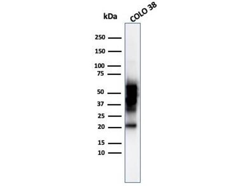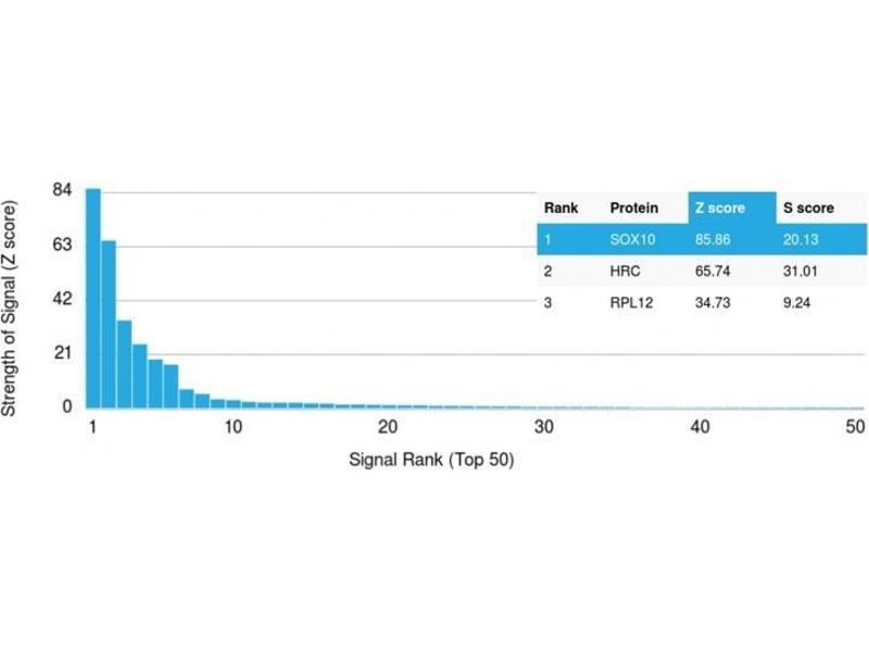 - The specificity of this monoclonal antibody to its intended target was validated by HuProtTM Array, containing more than 19,000, full-length human proteins. Recognizes a protein of ~55 kDa, identified as SOX10. This MAb is highly specific and does not cross-react with other members of the SOX-family. SOX genes comprise a family of genes that are related to the mammalian sex-determining gene SRY. These genes similarly contain sequences that encode for the HMG-box domain, which is responsible for the sequence-specific DNA-binding activity. SOX-10 is a sensitive marker of melanoma, including conventional, spindled, and desmoplastic subtypes. It is expressed by metastatic melanomas and nodal capsular nevus in sentinel lymph nodes, but not by other lymph node components such as dendritic cells, which usually express S100 protein. Commonly used melanoma markers, such as anti-HMB-45 and anti-Melan-A, are poorly expressed in desmoplastic melanomas while SOX-10 is moderately to strongly expressed in desmoplastic melanomas. SOX-10 is considered as a very reliable marker for recognizing residual desmoplastic melanomas. In normal tissues, it is expressed in Schwann cells, melanocytes, and myoepithelial cells of salivary, bronchial and mammary glands. SOX-10 expression is also observed in mast cells.