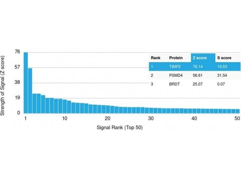 - It recognizes a protein of 21 kDa, identified as tissue inhibitor of metalloproteinases-2 (TIMP-2). It is closely related to TIMP-1 and shows the highest binding affinity to both the latent (pro) and active forms of 72 kDa Type IV collagenase (also known as MMP-2 or gelatinase A). It also has affinity for the active form of 92 kDa Type IV collagenase (also known as MMP-9 or gelatinase B). TIMP-2 inhibits the proteolytic invasiveness of tumor cells and normal placental trophoblast cells.