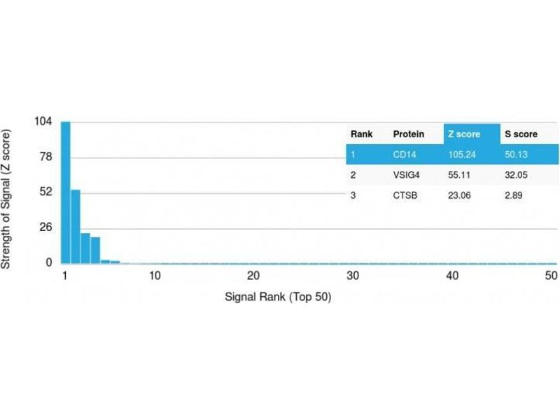 - Recognizes a protein of 55 kDa, identified as CD14 (also known lipopolysaccharide receptor). CD14 is expressed strongly on monocytes and macrophage and weakly on the surface of neutrophils. CD14 is anchored to cells by linkage to glycosylphosphatidylinositol (GPI) and functions as a high affinity receptor for complexes of LPS and LPS binding protein (LBP). Soluble CD14, also binding to LPS, acts at physiological concentration as an LPS agonist and has, at higher concentrations, an LPS antagonizing effect in cell activation.