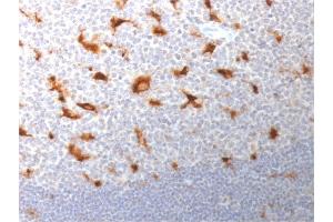 This antibody recognizes a glycoprotein of 110 kDa, which is identified as CD68. It is important for identifying macrophages in tissue sections. It stains macrophages in a wide variety of human tissues, including Kupffer cells and macrophages in the red pulp of the spleen, in lamina propria of the gut, in lung alveoli, and in bone marrow. It reacts with myeloid precursors and peripheral blood granulocytes. It also reacts with plasmacytoid T cells, which are supposed to be of monocyte/macrophage origin. It shows strong granular cytoplasmic staining of chronic and acute myeloid leukemia and also reacts with rare cases of true histiocytic neoplasia. Lymphomas are negative or show few granules.
