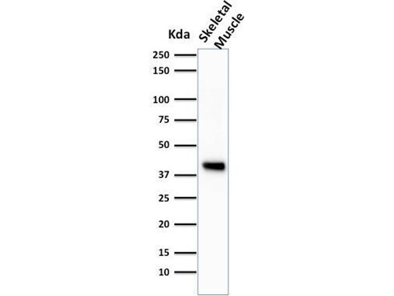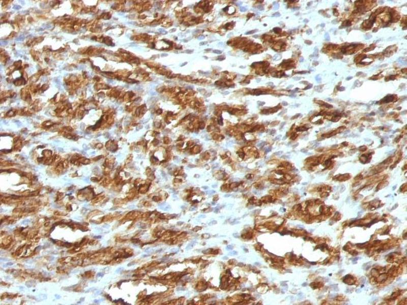 - This antibody recognizes actin of skeletal, cardiac, and smooth muscle cells. It is not reactive with other mesenchymal cells except for myoepithelium. Actin can be resolved on the basis of its isoelectric points into three distinctive components: alpha, beta, and gamma in order of increasing isoelectric point. Anti-muscle specific actin recognizes alpha and gamma isotypes of all muscle groups. Non-muscle cells such as vascular endothelial cells and connective tissues are non-reactive. Also, neoplastic cells of non-muscle-derived tissue such as carcinomas, melanomas, and lymphomas are negative.It stains tumors of smooth muscle (leiomyomas and leiomyosarcomas) as well as skeletal muscle (rhabdomyomas and rhabdomyosarcomas).