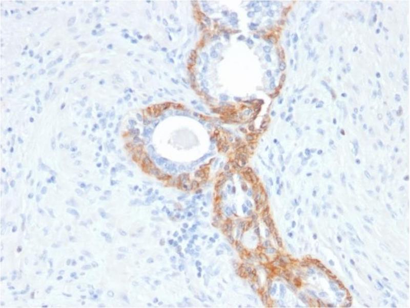 - This antibody recognizes CK1, CK5, CK10 and CK14. In normal epithelia, it stains stratified epithelia, myoepithelial cells and basal cells in the prostate gland and bronchi. This MAb shows no reactivity with hepatocytes, pancreatic acinar cells, proximal renal tubules, or endometrial glands, there is no reactivity with cells derived from simple epithelia. Mesenchymal tumors, lymphomas, melanomas, neural tumors, and neuroendocrine tumors are negative with this antibody. It stains myoepithelial cells and has been shown to be useful in distinguishing prostate adenocarcinoma from benign prostate. This antibody has also been useful in separating benign from malignant intraductal breast proliferations.