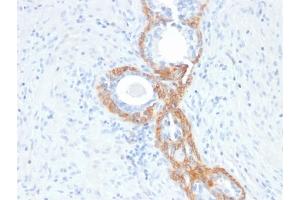 This antibody recognizes CK1, CK5, CK10 and CK14. In normal epithelia, it stains stratified epithelia, myoepithelial cells and basal cells in the prostate gland and bronchi. This MAb shows no reactivity with hepatocytes, pancreatic acinar cells, proximal renal tubules, or endometrial glands, there is no reactivity with cells derived from simple epithelia. Mesenchymal tumors, lymphomas, melanomas, neural tumors, and neuroendocrine tumors are negative with this antibody. It stains myoepithelial cells and has been shown to be useful in distinguishing prostate adenocarcinoma from benign prostate. This antibody has also been useful in separating benign from malignant intraductal breast proliferations.