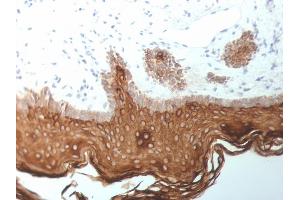 - It recognizes polypeptides of 58 kDa, 56 kDa, and 45 kDa, identified as cytokeratin 5, 6, and 18 respectively. It shows no reaction with keratin 1, 8, or 19. This MAb shows a broad pattern of reactivity with epithelial tissues, from simple glandular epithelia to stratified squamous epithelia. Epithelial cells are labeled whether they are ectodermal, mesodermal, or endodermal in origin. This MAb is useful in detecting cells of epithelial origin in mixed tumors, in effusions, in bone marrow samples, or in tissue culture cells.
