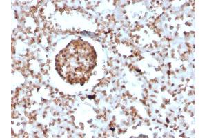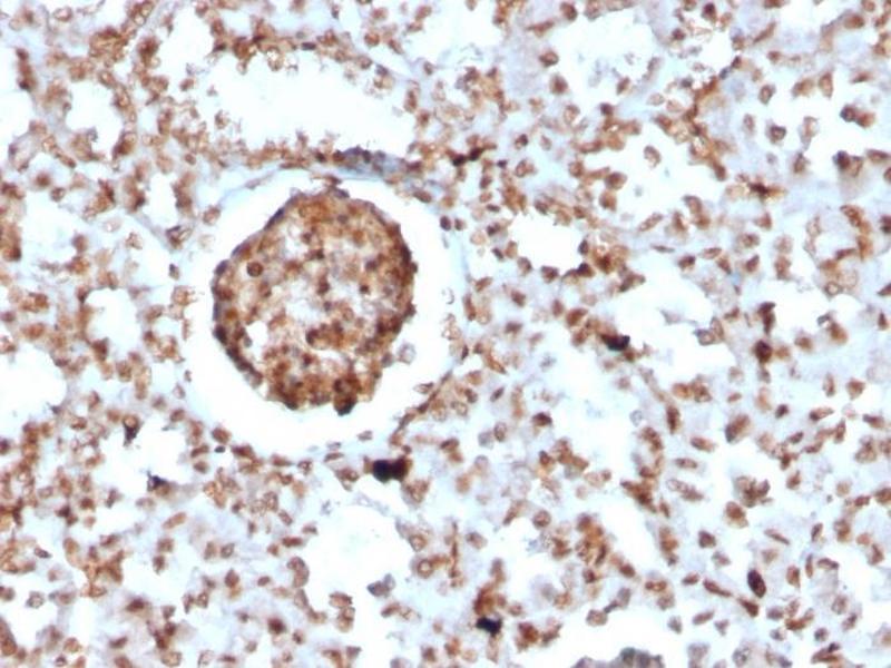 Known Application: Immunohistochemistry (Formalin-fixed) (0.5-1 μg/mL for 30 minutes at RT)[For staining of formalin-fixed tissues, incubate sections in 4N HCl for 30 minutes at RT followed by digestion with trypsin at 1 mg/mL PBS, 10 min at 37oC (Cat. #AP-9008)]Optimal dilution for a specific application should be determined.