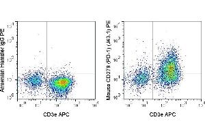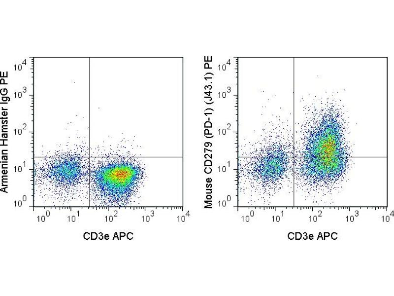 - The J43.1 antibody is specific for mouse CD279, also known as programmed death-1 (PD-1), a 55 kDa glycoprotein which can co- regulate T cell antigen receptor signaling and therefore modulate T cell activation. PD-1 exists in a monomeric form that is expressed by CD4- CD8- thymocytes, where it participates in the processes of clonal selection, elimination of autoreactive lymphocytes, and develop- ment of tolerance. PD-1 expression is also inducible upon activation of mature T cells, where it has been proposed to interact with the co- stimulatory receptor CD80 to limit T cell activation. Two ligands for PD-1, known as PD-L1 (B7-H1) and PD-L2 (B7-DC) are differentially expressed on T and B cells, monocytes, macrophages, NK cells or dendritic cells. PD-1 is a member of a family of receptors including CD28 and CTLA-4 (CD152), which interact with ""B7"" ligands to provide a balance of co-stimulatory /co-inhibitory signaling important in T cell activation, tolerance, and autoimmunity.The J43.1 antibody may be used as a marker for PD-1 expression, and is commonly used for analysis of receptor-ligand interaction and function(s) in vitro and in vivo.