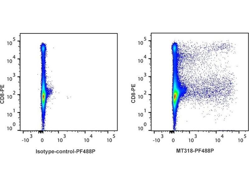 - Detection of IFN-γ producing cells by flow cytometry. 5 μL is recommended for staining of 1 million cells in a total volume of 50 μL. Detection of IFN-γ by flow cytometry in viable rabbit spleen cells. Cells were stimulated for 5 hours in the presence of PMA/ionomycin and Brefeldin A. Cells were then fixed and permeabilized using 4 % paraformaldehyde and saponin, and subsequently stained with CD8-PE and MT318-PF488P (right panel). The left panel depicts cells stained with a matched isotype control antibody. The dot plots derive from gated events of typical lymphocyte characteristics in forward and side light scatter. Flow cytometry was performed on a BD FACSVerse system.
