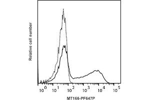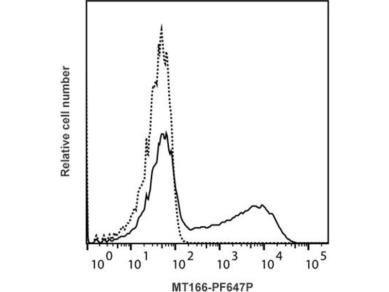 - Detection of equine IFN-γ producing cells by flow cytometry. 5 μL is recommended for staining of 1 million cells in a total volume of 50 μL. PF647P is excited by the red laser (633 nm). The excitation max is 654 nm and the emission max is 672 nm. Detection of IFN-γ by flow cytometry in viable equine PBMC. Cells were stimulated for 16 hours in the presence of PMA/ionomycin and Brefeldin A. Cells were then fixed and permeabilized using 4 % paraformaldehyde and saponin, and subsequently stained with MT166- PF647P (solid line). Matched isotype control antibody (dashed line). The histogram derives from gated events of typical lymphocyte characteristics in forward and side light scatter. Flow cytometry was performed on a BD FACSVerse system.