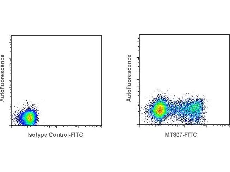 - Detection of IFN-γ producing cells by flow cytometry. 5 μL is recommended for staining of 1 million cells in a total volume of 50 μL. Detection of IFN-γ by flow cytometry in bovine peripheral blood mononuclear cells (PBMC). Bovine PBMC were stimulated with PMA/ionomycin for 16 hours in the presence of Brefeldin A. The cells were then fixed and permeabilized using 4 % paraformaldehyde and saponin, and subsequently stained with anti-bovine IFN-γ mAb MT307-FITC (right panel). The left panel depicts stimulated cells stained with a matched isotype control antibody. The dot plots derive from a lymphocyte gate. Flow cytometry was performed on a Guava EasyCyte Mini.