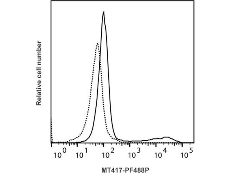 - Detection of cotton rat IFN-γ producing cells by flow cytometry. 5 μL is recommended for staining of 1 million cells in a total volume of 50 μL. Detection of IFN-γ by flow cytometry in viable cotton rat spleen cells. Cells were stimulated for 16 hours in the presence of PMA/ ionomycin and Brefeldin A. Cells were then fixed and permeabilized using 4 % paraformaldehyde and saponin, and subsequently stained with MT417-PF488P (solid line). Matched isotype control antibody (dashed line). The histogram derives from gated events of typical lymphocyte characteristics in forward and side light scatter. Flow cytometry was performed on a BD FACSVerse system.