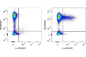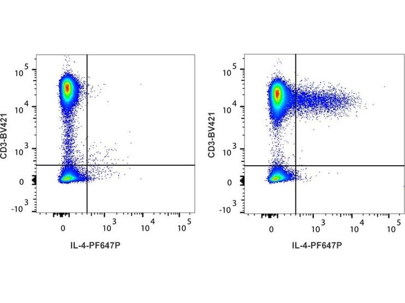 Detection of IL-4 producing cells by flow cytometry. 5 μL is recommended for staining of 1 million cells in a total volume of 50 μL. Detection of IL-4 by flow cytometry in viable human PBMC. Cells were stimulated for 16 hours in the presence of PMA/ionomycin and Brefeldin A. Cells were stained with anti-CD3-BV421, fixed and permeabilized using 4 % paraformaldehyde and saponin, and further stained with PF647P-conjugated mAb IL4-3 (right panel). Non-stimulated cells shown as reference (left panel). The dot plot derives from gated events of typical lymphocyte characteristics in forward and side light scatter. Flow cytometry was performed on a BD FACSVerse system.
