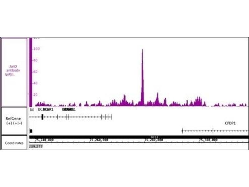 JunD (Jun D proto-oncogene) is a member of the JUN family and forms a component of the AP-1 transcription factor complex. JunD binds DNA as a dimer. Other AP-1 family members consist of c-Fos, Fra-1, Fra-2, FosB, c-Jun, and JunD. JunD antibody (pAb) was raised in a Rabbit host. It has been validated for use in ChIP-Seq, Immunoprecipitation and Western blot, it has been shown to react with Human samples.