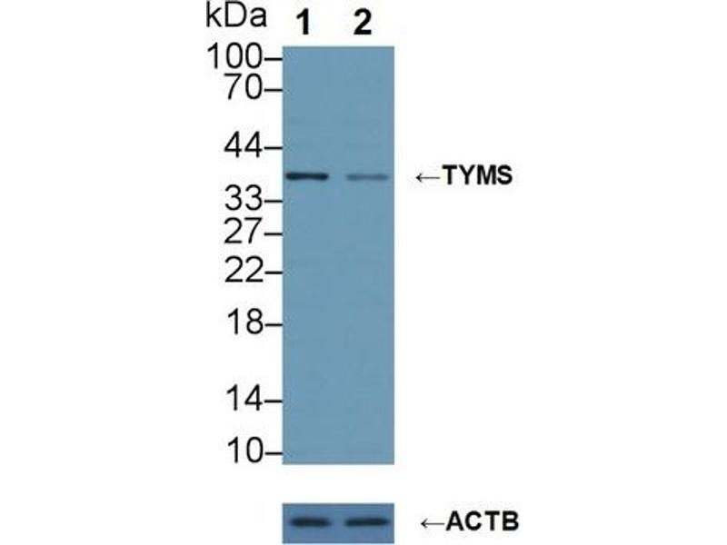- The antibody is a rabbit polyclonal antibody raised against TYMS. It has been selected for its ability to recognize TYMS in immunohistochemical staining and western blotting.