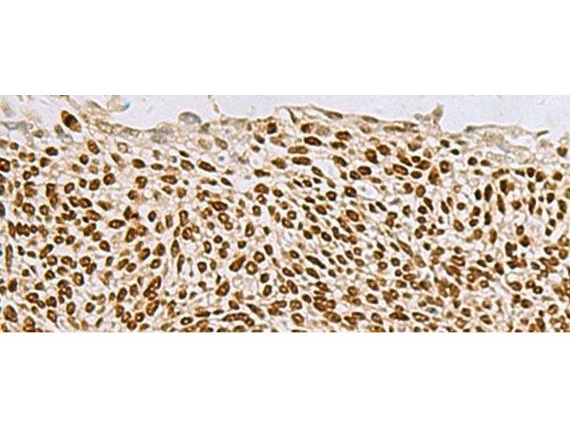 - TP63,also named KET,P63,P73H,P73L and TP73L,belongs to the p53 family. It is a homologue of the tumor suppressor p53 and p73 genes. It is involved in malignancy acquisition and maintenance of cells. Unlike p53,the p63 gene encodes multiple isotypes with remarkably divergent abilities to transactivate p53 reporter genes and induce apoptosis. TP63 acts as a sequence specific DNA binding transcriptional activator or repressor. TP63 has 12 isoforms with MW 40kd(P40),50kd(P60),63kd(P63) and 73kd(P73L). It is Nuclear stain.