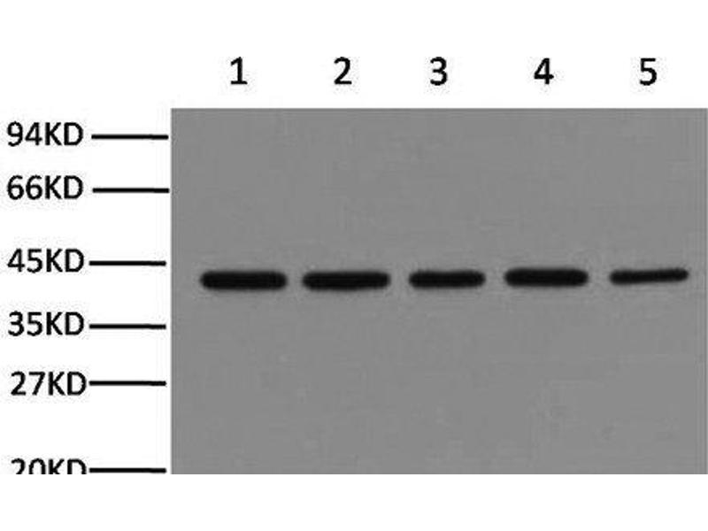 - Beta actin, also named as ACTB and F-Actin, belongs to the actin family. Actins are highly conserved globular proteins that are involved in various types of cell motility and are ubiquitously expressed in all eukaryotic cells. At least six isoforms of actins are known in mammals and other vertebrates: alpha (ACTC1, cardiac muscle 1), alpha 1 (ACTA1, skeletal muscle) and 2 (ACTA2, aortic smooth muscle), beta (ACTB), gamma 1 (ACTG1) and 2 (ACTG2, enteric smooth muscle). Beta and gamma 1 are two non-muscle actin proteins. Most actins consist of 376aa, while ACTG2 (rich in muscles) has 375aa and ACTG1(found in non-muscle cells) has only 374aa. Beta actin has been widely used as the internal control in RT-PCR and Western Blotting as a 42-kDa protein. However, the 41 kDa cleaved fragment of beta actin can be generated during apoptosis process. This antibody can recognize all the actins.