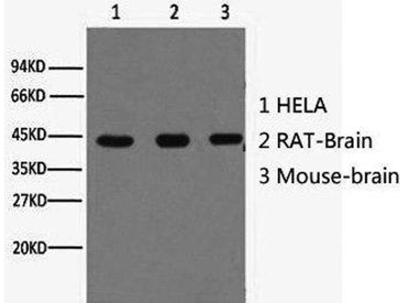 - Beta actin, also named as ACTB and F-Actin, belongs to the actin family. Actins are highly conserved globular proteins that are involved in various types of cell motility and are ubiquitously expressed in all eukaryotic cells. At least six isoforms of actins are known in mammals and other vertebrates: alpha (ACTC1, cardiac muscle 1), alpha 1 (ACTA1, skeletal muscle) and 2 (ACTA2, aortic smooth muscle), beta (ACTB), gamma 1 (ACTG1) and 2 (ACTG2, enteric smooth muscle). Beta and gamma 1 are two non-muscle actin proteins. Most actins consist of 376aa, while ACTG2 (rich in muscles) has 375aa and ACTG1(found in non-muscle cells) has only 374aa. Beta actin has been widely used as the internal control in RT-PCR and Western Blotting as a 42- kDa protein. However, the 41 kDa cleaved fragment of beta actin can be generated during apoptosis process. This antibody can recognize all the actins.