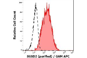 Sushi domain containing 2,SUSD2 (sushi domain containing protein 2) is a type I transmembrane protein, that serves as an important marker of bone marrow-derived mesenchymal stem-like cells (bone marrow stromal cells). These pluripotent cells are important for techniques of autologous cell therapy, and can be collected from e.g. endometrium, or palatine tonsil. SUSD2 seems to be a tumor supresor, and is down-regulated in colon cancer tissues, whereas it is highly expressed e.g. in breast cancer.