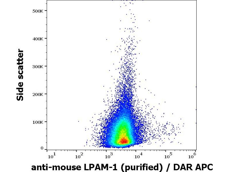 Integrin alpha 4 / beta 7 (CD49d / Ly69) , also known as LPAM-1 (Llmphocyte Peyer´s patch adhesion molecule 1), is a heterodimeric (150 kDa / 130 kDa) integrin complex which mediates lymphocyte homing to Peyer´s patch high endothelial venules and to the intestinal lamina propria. It is expressed primarily on mucosal lymphocytes, but is also present on NK cells and eosinophils. Ligands of LPAM-1 are MAdCAM-1, VCAM-1, and fibronectin, but the alpha 4 subunit (CD49d) can mediate also homotypic adhesion.,Integrin alpha 4 beta 7, CD49d / Ly69