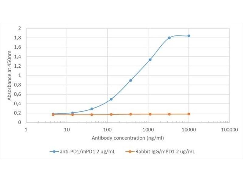 - The specificity of this antibody has been confirmed in ELISA analysis, using PD-1 extracellular domain fusion proteins (Agata et al, 1996). Additionally, in flow cytometric analysis, this antibody reacts with PD-1 cDNA-transfected BHK and CHO cells, but not with parental BHK and CHO cells, as well as reacting with lymphocytes from PD-1 cDNA transgenic mice (Agata et al, 1996). This antibody has been used to immunoprecipitate PD-1 from lysates of PD-1 cDNA-transfected BHK and CHO cells (Agata et al, 1996), in flow cytometric quantification of CD4+PD-1+ T cells in murine spleens (Kasagi et al, 2010), and in immunohistochemical analysis of acetone-fixed murine spinal cord and brain tissue sections (Salama et al, 2003). This antibody displays diverse effects in different mouse models of disease. When administered to NZB/W F1 mice, a model of lupus-like nephritis, this antibody has been shown to delay the onset of nephritis and prolong survival, through the depletion of PD-1+ T cells (Kasagi et al, 2010). Antibody-treated NZB/W F1 mice displayed decreased numbers of PD-1+ T cells, and this antibody was confirmed to trigger complement-dependent cytotoxicity in PD-1+ T cells in vitro (Kasagi et al, 2010). Conversely, administration to experimental allergic encephalitis (EAE) and NOD diabetes mice exacerbated disease, through its neutralising activity (Salama et al, 2003, Ansari et al, 2003), this antibody has been shown in vitro to inhibit binding of both PD-L1-Ig and PD-L2-Ig to PD-1 transfected BHK cells (Ansari et al, 2003).