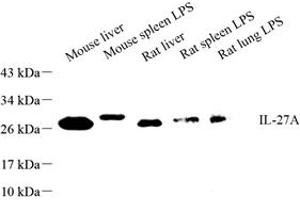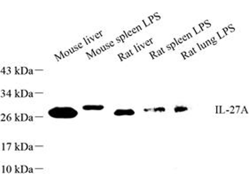 Interleukin 27 (IL-27) is a member of the IL-12 cytokine family. It is a heterodimeric cytokine that is composed of two distinct genes, Epstein-Barr virus-induced gene 3 (EBI3) and IL-27p28. IL-27 is expressed by antigen presenting cells and interacts with a specific cell-surface receptor complex known as IL-27 receptor (IL-27R). This receptor consists of two proteins, IL-27? and gp130. IL-27 induces differentiation of the diverse populations of T cells in the immune system and also upregulates IL-10.
