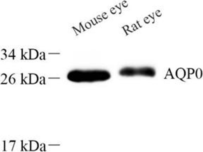 Aquaporin 0 or MIP26 (major intrinsic protein 26kD), and Aquaporin 1 has been the foundation of the growing family of aquaporins. The lens specific Aquaporin 0 represents up to 80 % of total lens membrane protein. Defects in Aquaporin 0 are a cause of autosomal recessive congenital cataract. The lens opacity mutation (LOP) is an AA substitution that inhibits targeting of MIP to the cell membrane. Human Aquaporin 0 is a 263 amino acid transmembrane protein belonging to the MIP family. Aquaporin families of proteins are predicted to contain six transmembrane domains.