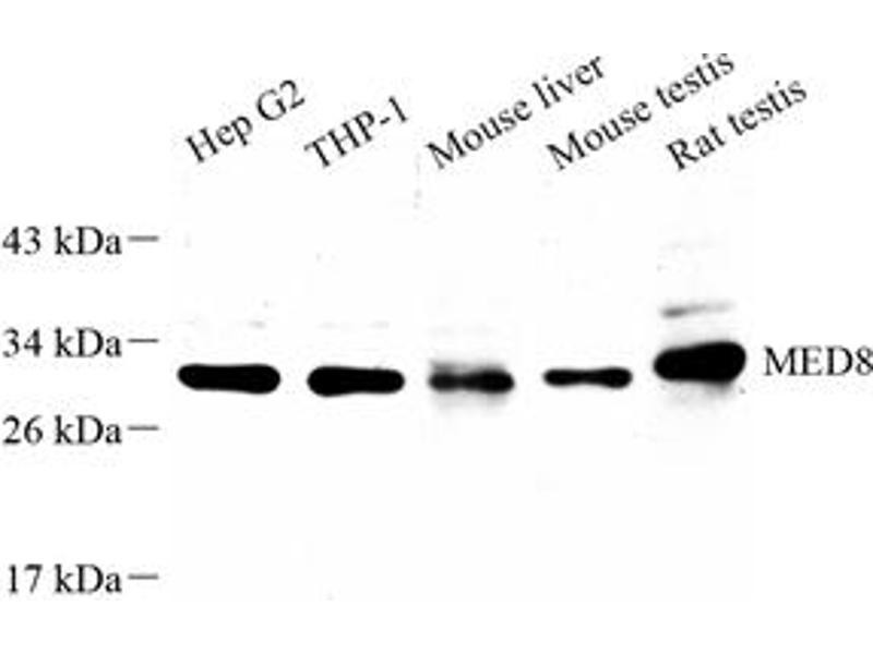 - MED8, a component of the Mediator complex, is a coactivator involved in the regulated transcription of nearly all RNA polymerase II-dependent genes. It plays a role as a target recruitment subunit in E3 ubiquitin-protein ligase complexes and thus in ubiquitination and subsequent proteasomal degradation of target proteins. MED8 has three isoforms with MW 19 kDa, 29 kDa and 33 kDa. And the ubiquitination form will be 38-43 kDa.