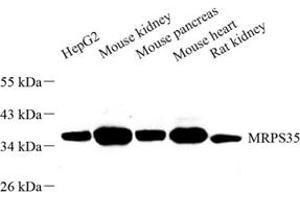 MRPS35 (mitochondrial ribosomal protein S35), also known as MDS023, MRPS28 or HDCMD11P, is a 323 amino acid protein that localizes to the mitochondrion, where it exists as a component of the 28S ribosomal subunit and works in conjunction with other MRPs to mediate protein synthesis. Existing as two alternatively spliced isoforms, MRPS35 is encoded by a gene located on human chromosome 10, which houses over 1,200 genes and comprises nearly 4.5 % of the human genome. This antibody is a rabbit polyclonal antibody raised against the full length MRPS35 protein. It specifically reacts with the 37kd MRPS35protein.