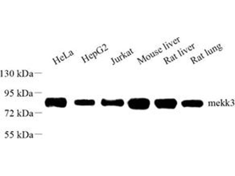 The mitogen-activated protein/ERK kinase kinase 3 (MEKK3) is a member of a family of MEKK/Ste11 serine/threonine protein kinases. One function of MEKK3 is to serve as an upstream regulatory kinase in the mitogen activated protein kinase cascade, however, it also plays a critical role in other signaling pathways. MEKK3 regulates several important functions including cell survival and proliferation. It is ubiquitously expressed in multiple tissues and has been found in complexes with scaffold proteins and other kinases.Cerebral cavernous malformations (CCMs) complex regulation of MEKK3 is essential during vertebrate heart development. MEKK3 signalling and KLF2/4 may be targeted to develop new CCM therapeutics.