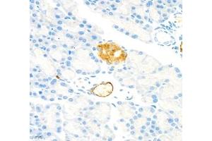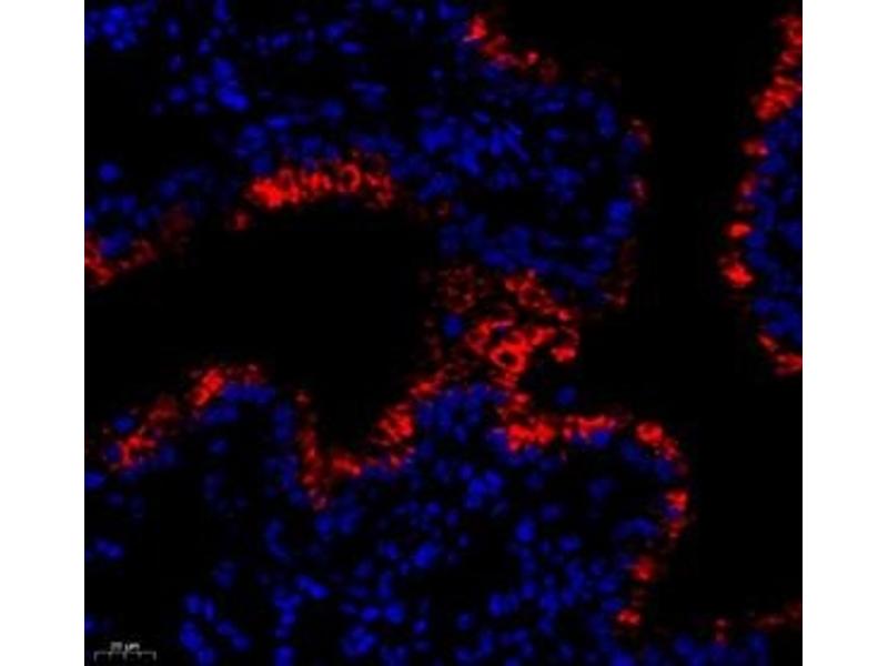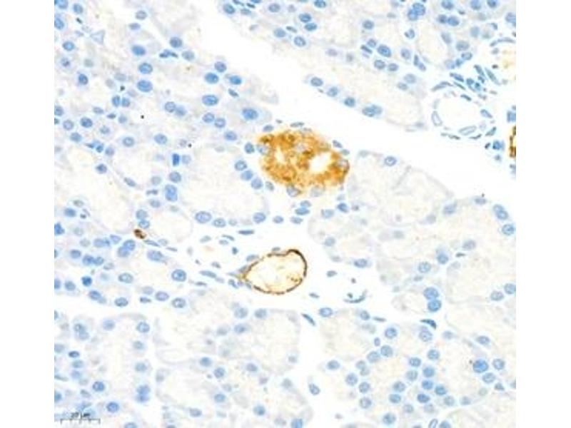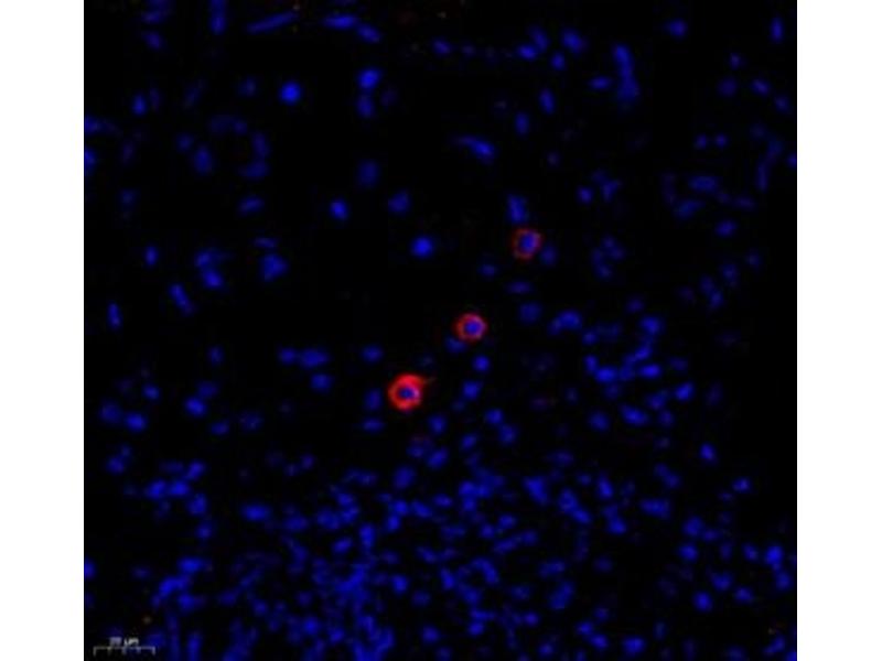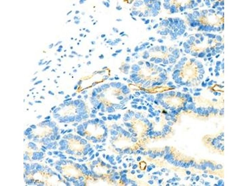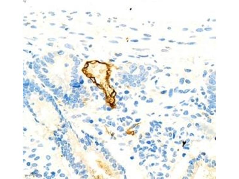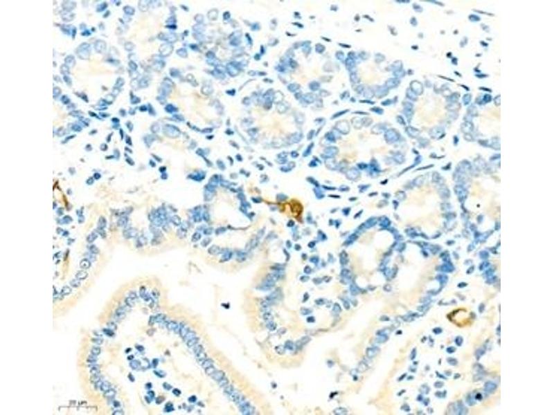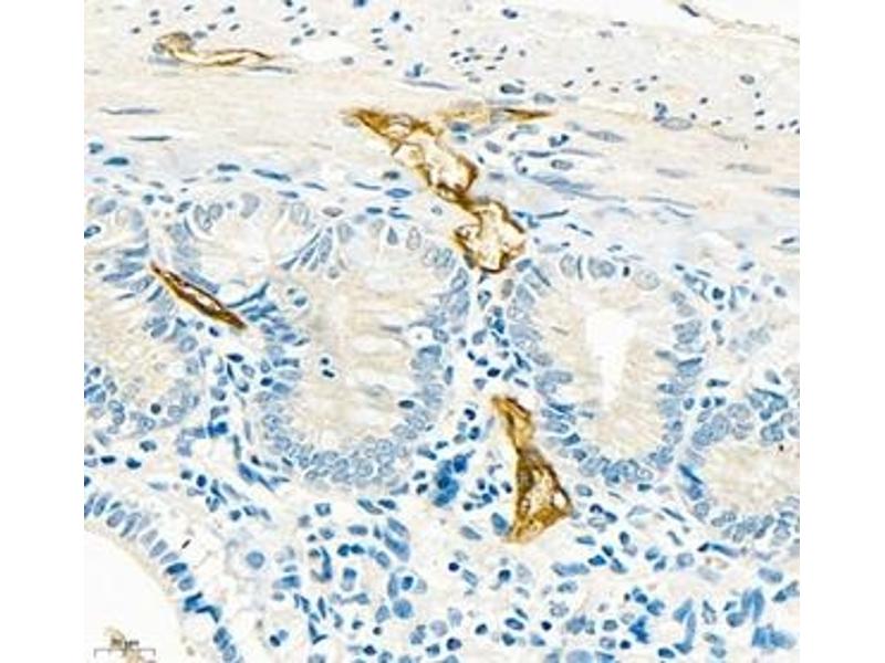 MAdCAM-1 is an immunoglobulin (Ig) cell adhesion molecule family member. MAdCAM-1 is involved in lymphocyte homing to mucosal sites and is expressed on high endothelial venules (HEV) of both mesenteric lymph nodes and Peyer's patches. It has also been found to be expressed on sinus-lining cells of the spleen. The integrin, alpha 4 beta 7, has been shown to function as the MAdCAM-1 receptor. The Ig domains of MAdCAM-1 have been found to be critical to alpha 4 beta 7 binding. The mucin domain has been shown to have activity in L-Selectin binding.