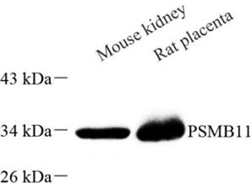 PSMB11 belongs to the peptidase T1B family. It is a multicatalytic proteinase complex which is characterized by its ability to cleave peptides with Arg, Phe, Tyr, Leu, and Glu adjacent to the leaving group at neutral or slightly basic pH . PSMB11 has an ATP-dependent proteolytic activity. Incorporated instead of PSMB5 or PSMB8, this unit reduces the chymotrypsin-like activity of the proteasome. It plays a pivotal role in development of CD8-positive T cells. The antibody is specific to PSMB11.