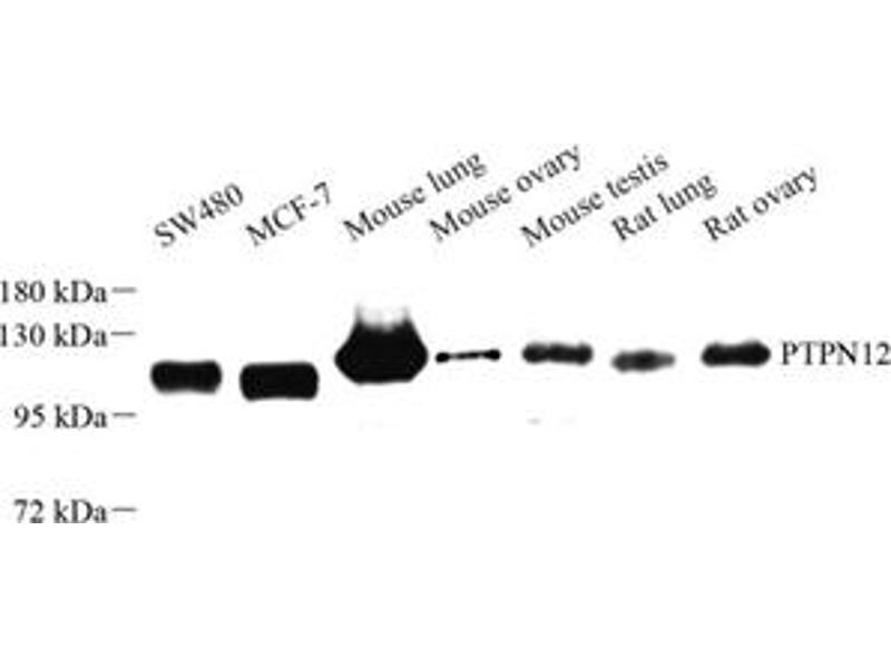 The PTPN12 is a member of the protein tyrosine phosphatase (PTP) family. PTPs are signaling molecules that regulate a variety of cellular processes including cell growth, differentiation, mitotic cycle, and oncogenic transformation. This PTP contains a C-terminal PEST motif, which serves as a protein-protein interaction domain, and may regulate protein intracellular half-life. This PTP was found to bind and dephosphorylate the product of the oncogene c-ABL and thus may play a role in oncogenesis. The PTP was also shown to interact with, and dephosphorylate, various products related to cytoskeletal structure and cell adhesion. This suggests it has a regulatory role in controlling cell shape and mobility.