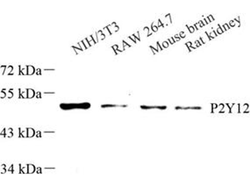 This anti-P2RY12 antibody is a Rabbit Polyclonal antibody detecting P2RY12 in WB, IHC and IF. Suitable for Mouse and Rat.
