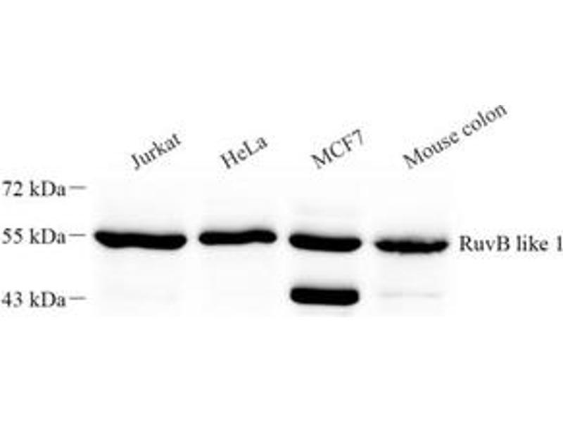 - RUVBL1 is a member of the AAA (ATPase associated with diverse cellular activities) family of proteins that is associated with several chromatin-remodelling complexes and has important roles in transcriptional regulation, the DNA damage response, telomerase activity, snoRNP assembly, cellular transformation and cancer metastasis[PMID: 21617703]. It consists of 456 amino acids (50 kDa) and interacts with TATA-binding protein (TBP), which is a central component for transcriptional regulation by forming complexes with various transcription regulators. RUVBL1 is a component of a large nuclear protein complex, possibly the RNA polymerase II holoenzyme.