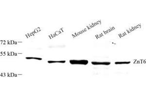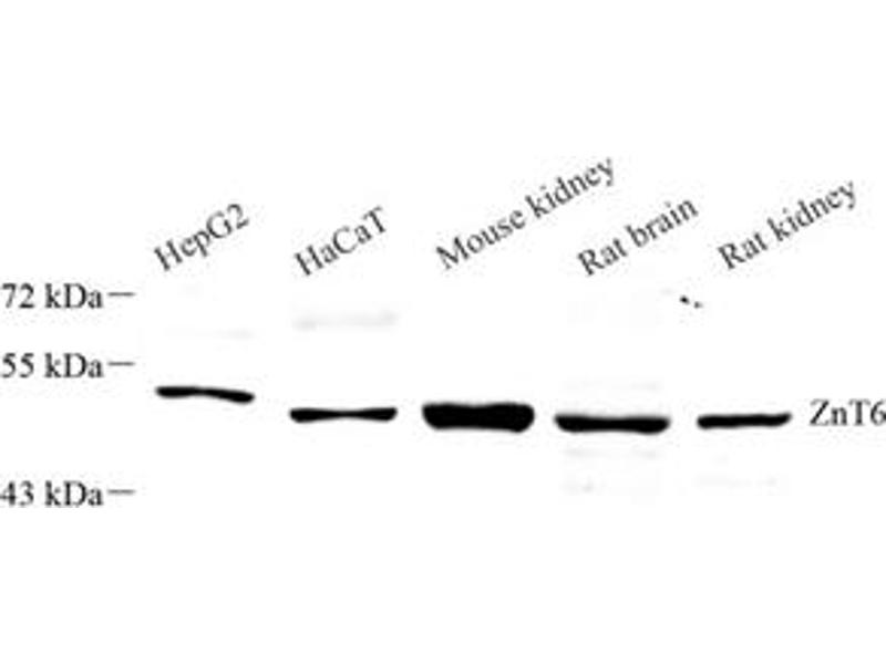 ZnT6 (encoded by SLC30A6) is a member of zinc transporters. ZnT6 is localized on the membrane of the Golgi apparatus as well as cytoplasmic vesicles. It may function in transporting the cytoplasmic zinc into the Golgi apparatus as well as the vesicular compartment. Altered expression of ZnT6 may correlate to neural diseases including Alzheimer's disease. Several isoforms of ZnT6 exist due to the alternative splicing, with MW around 48-56 kDa.