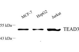 - TEAD3, others named ranscriptional enhancer factor 5(TEF5), a member of family of transcription factors that plays a key role in the Hippo signaling pathway, suggesting involve in organ and tumor suppression by restricting proliferation and promoting. TEAD3 contains the TEA/ATTS DNA-binding domain. Human TEAD3 has a strong mRNA expression in placenta and choriocarcinoma cells(JEG-3), but low in Hela, HepG2 and MCF-7. This is a rabbit polyclonal anti-TEAD3 antibody raised against part of C-terminal chain of human TEAD3.