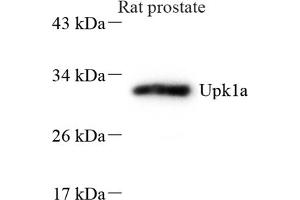 Uroplakins are a group of urothelial differentiation-related membrane proteins. They are components of the asymmetric unit membrane (AUM), which forms the apical plaques of mammalian urothelium and is believed to play a role in strengthening the urothelial apical surface thus preventing the cells from rupturing during bladder distention . Uroplakin-1a (UPK1A) belongs to the tetraspanin (TM4SF) family. UPK1A plays an important role in normal bladder epithelial physiology, possibly in regulating membrane permeability of superficial umbrella cells or in stabilizing the apical membrane.